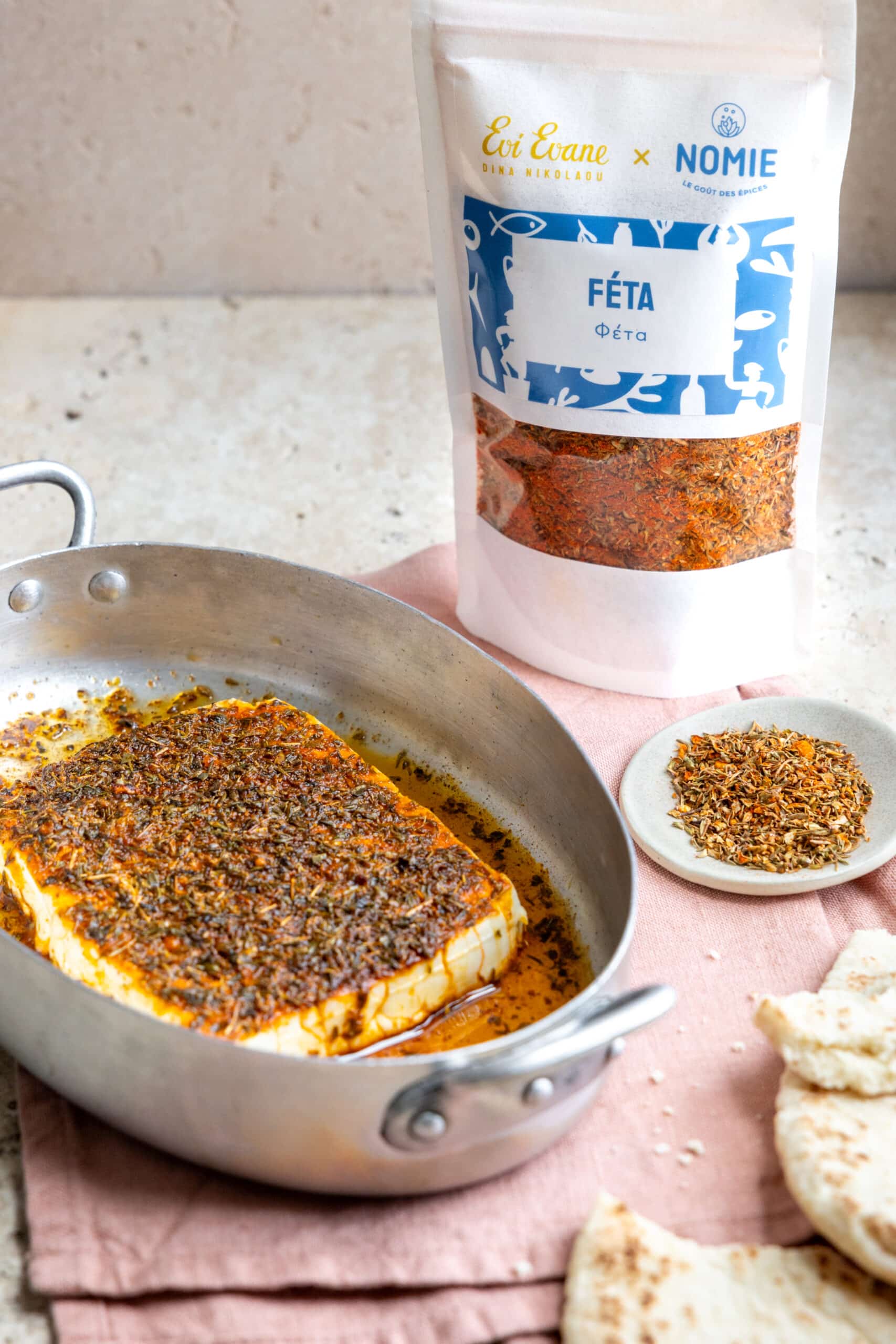 Le mélange Feta est une signature imaginée par Dina Nikolaou, cheffe grecque des adresses parisiennes Evi Evane, il est idéal pour saupoudrer sur ce fromage. La subtilité et l’originalité de ce mélange résident notamment dans l’utilisation de poudre de fruits grecs, récoltés en pleine maturité pour préserver au maximum leur goût et leurs nutriments. Ce mélange s’utilise sur de la feta, dans une salade grecque ou cuite au four, ainsi que dans tout plat d’inspiration hellénique ou méditerranéenne.
