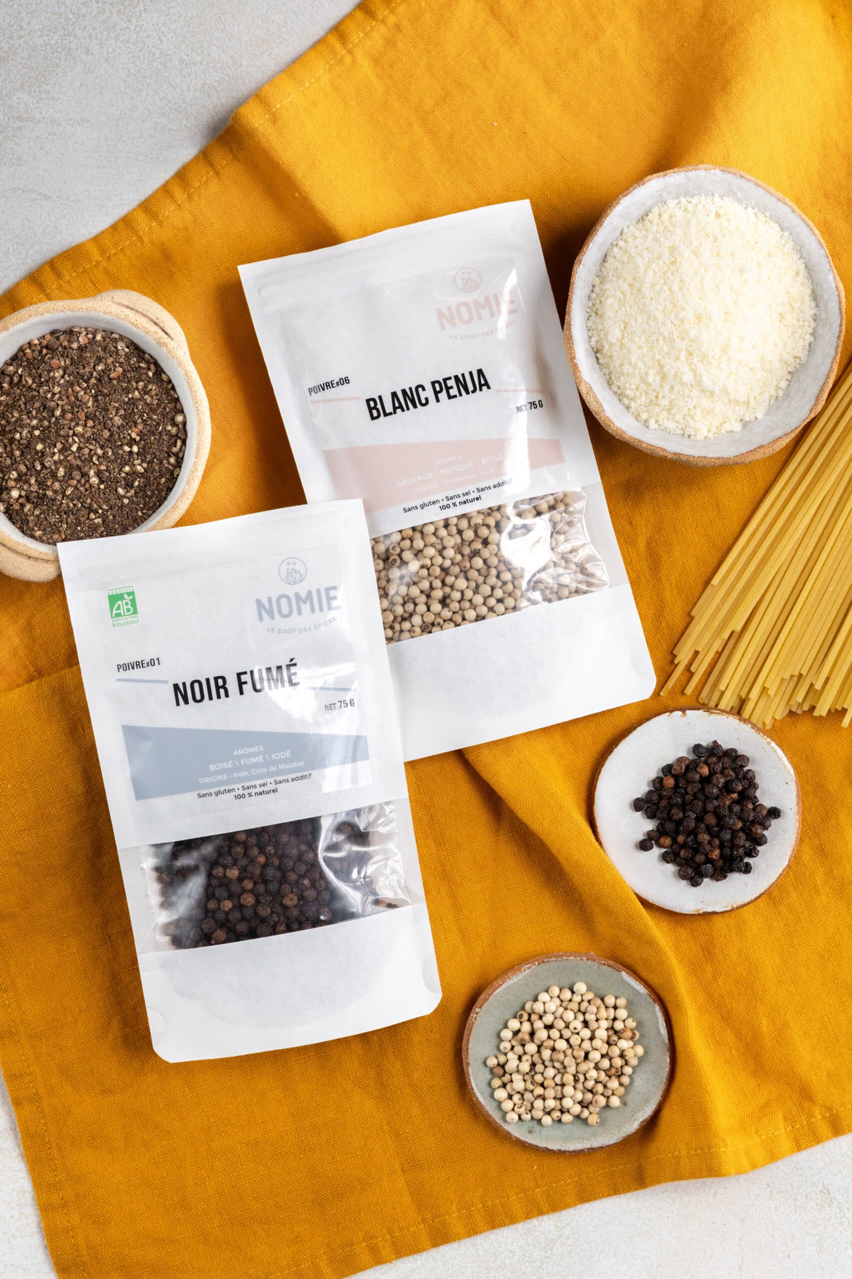 Cacio e pepe, un plat italien classique dont les origines remontent à l’Antiquité romaine, tire son nom de la simplicité de ses ingrédients, signifiant « fromage et poivre » en italien. Initialement créé par les bergers avec des pâtes sèches, du fromage de brebis (cacio), et du poivre noir lors de leurs déplacements, le plat incarne l’ingéniosité culinaire. Aujourd’hui, la recette associe le fromage pecorino romano à de l’eau de cuisson des pâtes pour créer une sauce crémeuse. Chez Nomie, nous aimons le préparer avec du Poivre noir fumé du Kerala et du Poivre blanc Penja.